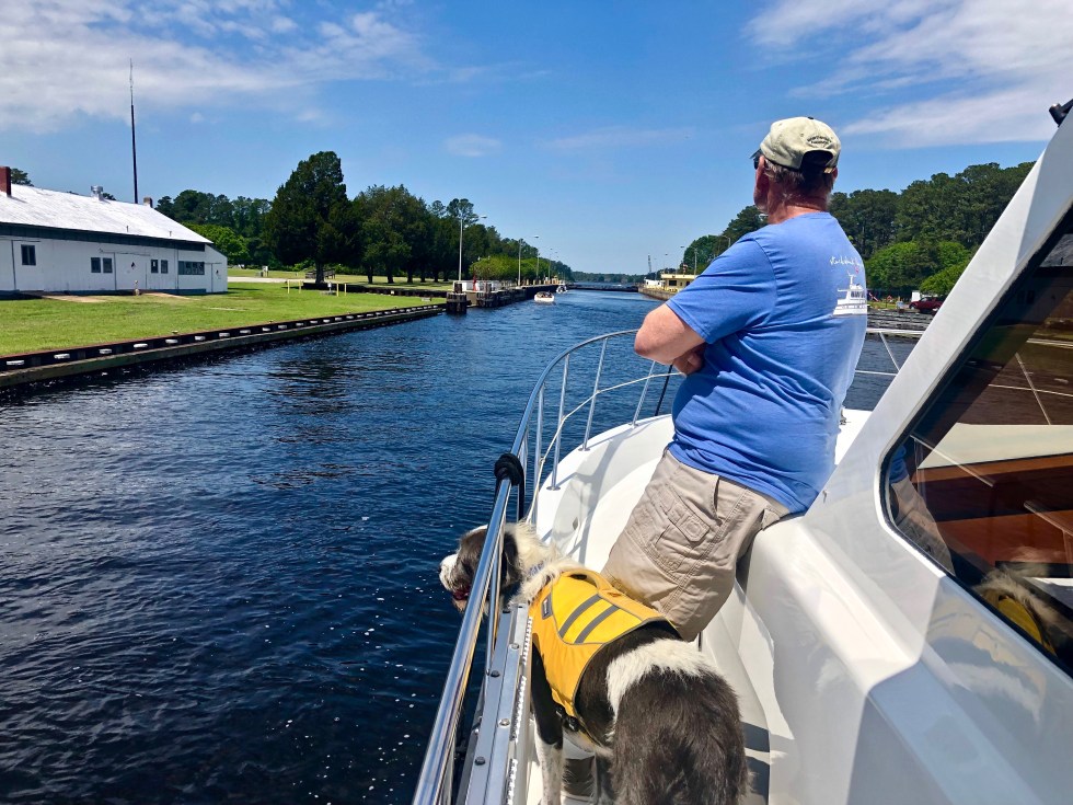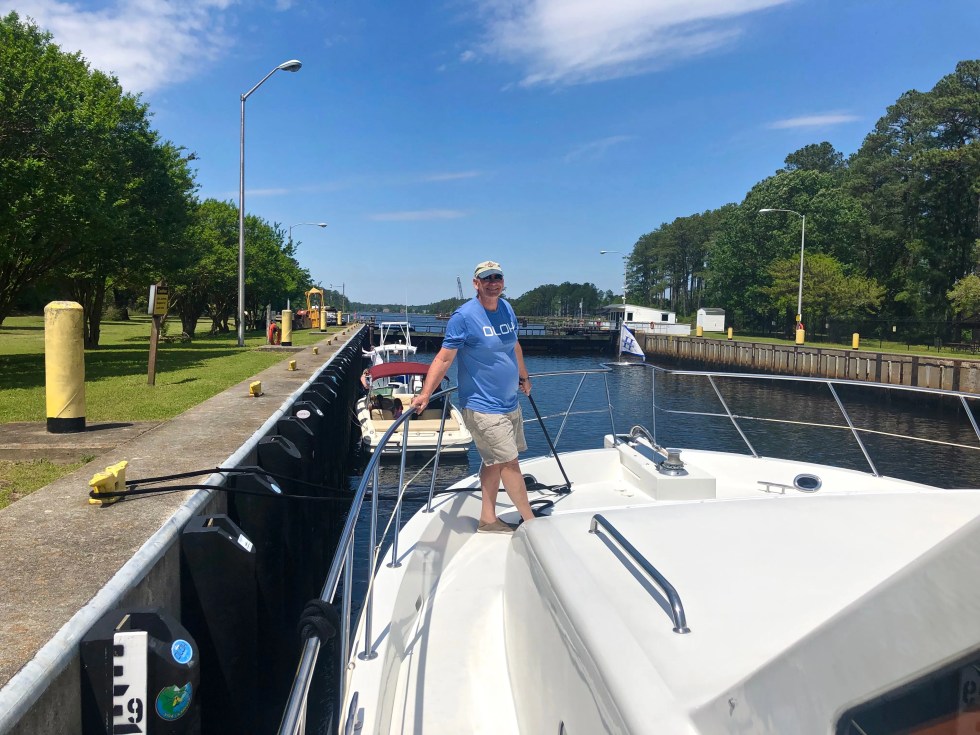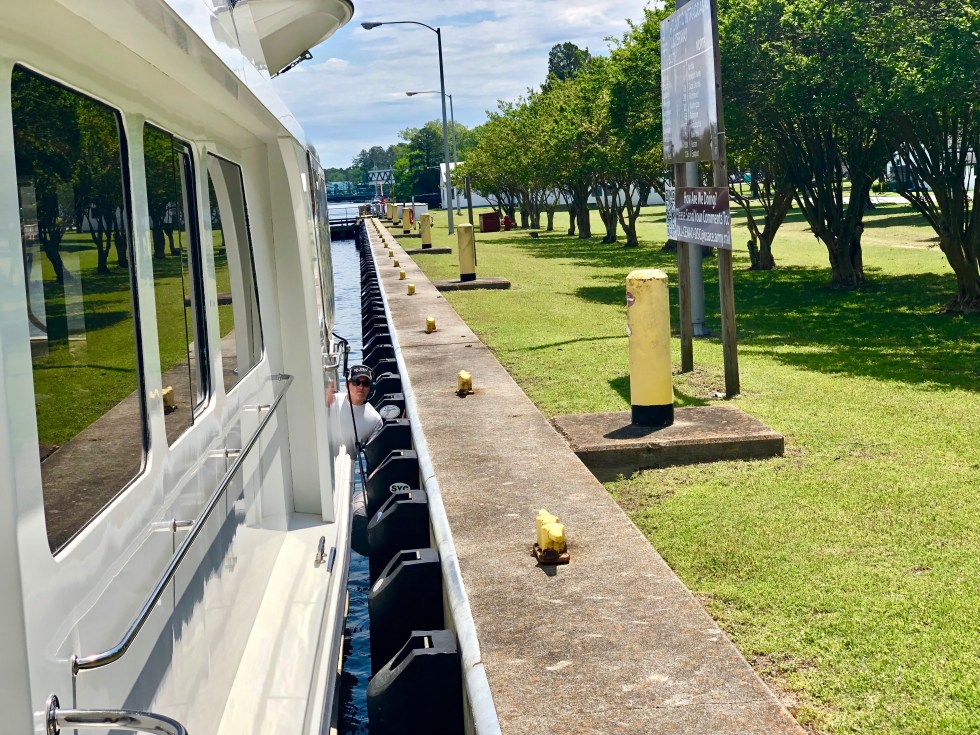 We closed a chapter and opened another one on this day. It was the first day we had Captain Scott from Cabo Waboat cruising with us and it was our last day on the Atlantic Intracoastal Waterway. We were also crossing another state line. The final fifty miles from Coinjock to Norfolk require some careful planning if you don’t want to potentially wind up waiting for a bridge for almost an hour. There are two bridges we have to open before reaching the Great Bridge bridge and lock (Great bridge is a town in Virginia). All but one of the bridges opens on a schedule and the Great Bridge bridge only opens on the hour. So we shoved off at 8:15 am, allowing for a little buffer in case we got stuck behind slow boats or had to slow a lot for other traffic, and we hit all of our marks all along the way. We love it when a plan comes together.