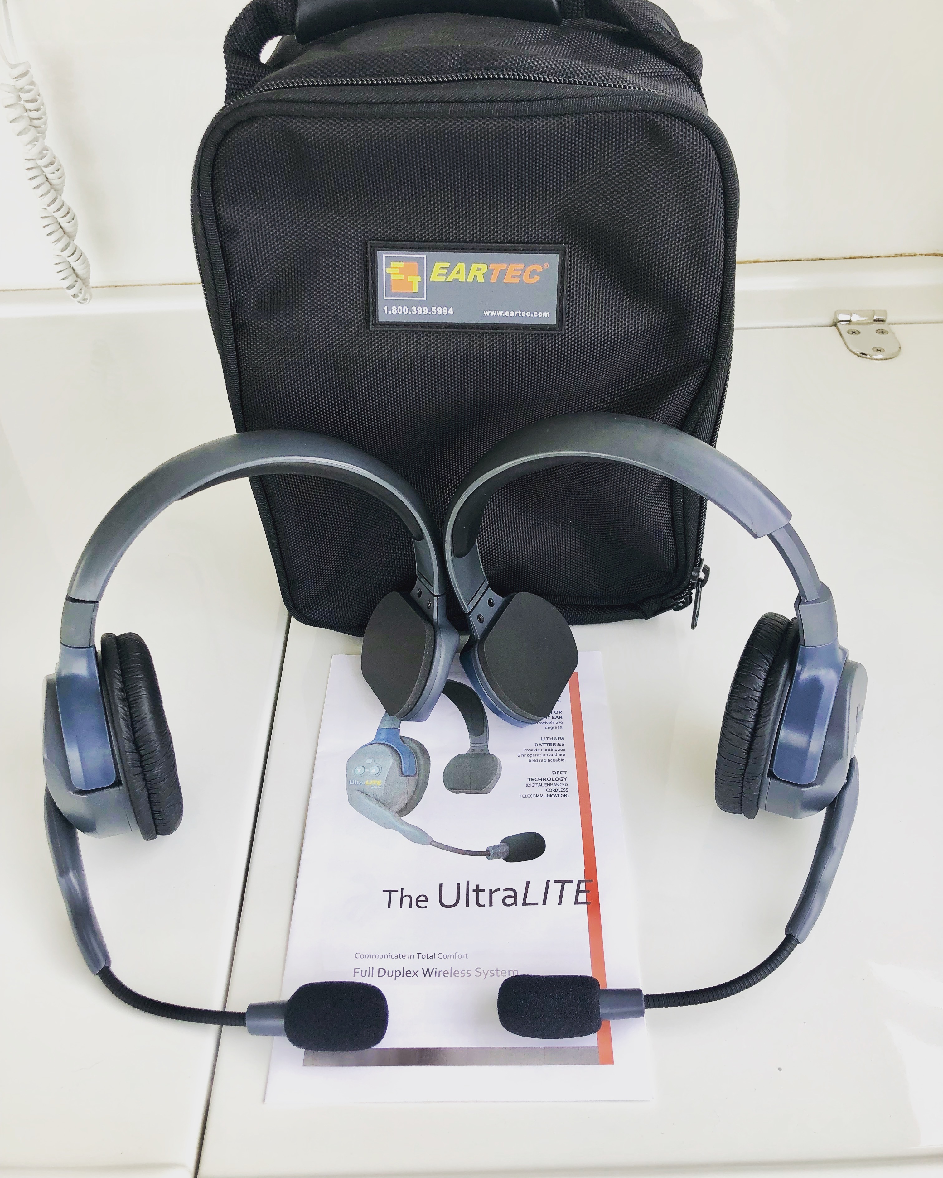 The headsets we had for several years on our last boat and for our first season with OLOH were the Eartec Simultalk 24G’s. They operate on a frequency not prone to interference and we found them to be generally reliable for the eight years we had them. They have a lightweight headset that keeps one ear open, an integrated adjustable “boom” microphone and a belt pack transceiver that houses the controls. Our biggest issue with them was that the belt pack could be a bit cumbersome and in one particular instance Tim’s pack fell off at exactly the wrong time (always the way it happens). After that incident and the malfunctioning of one of the headsets, we searched for a replacement.