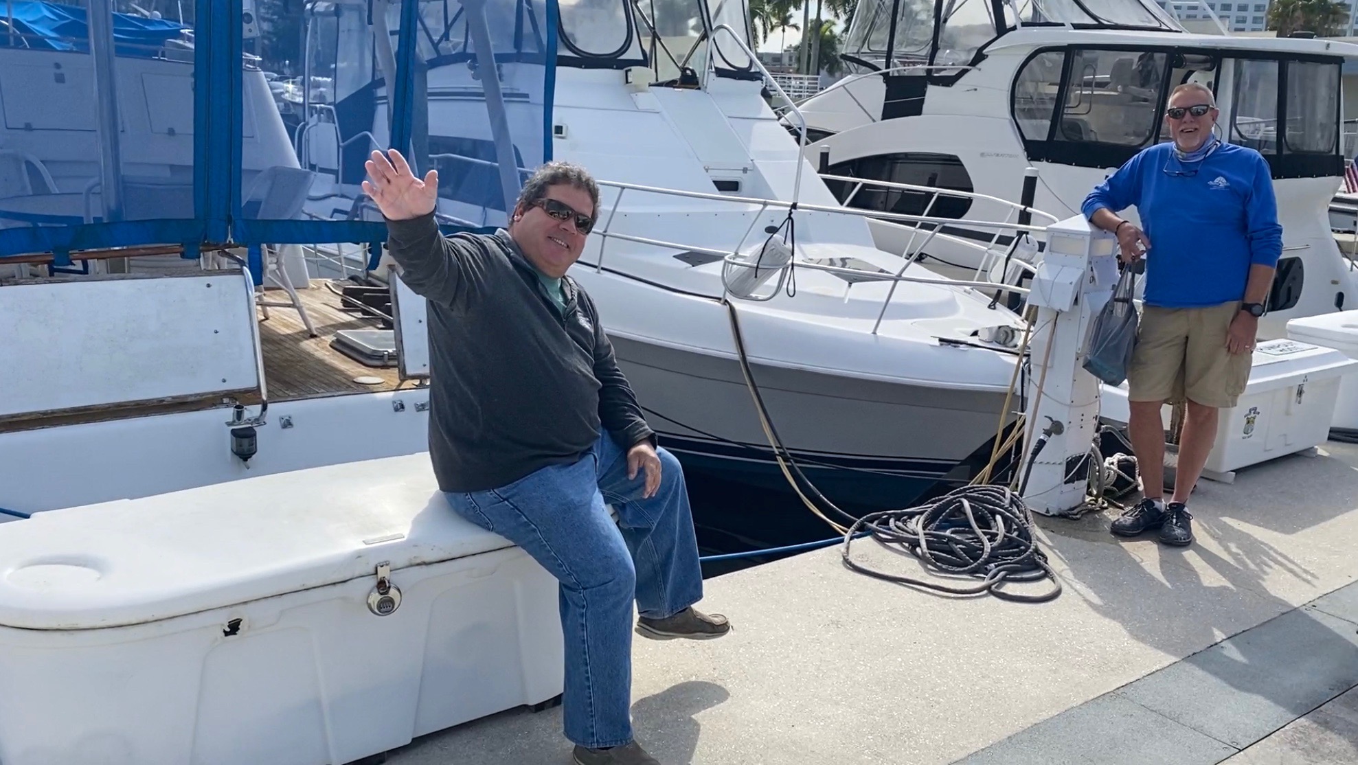 We usually stay at Legacy Harbor Marina when passing through Fort Myers, a very nice spot with floating docks. They typically only have one dock that can accommodate us and usually only for one night. Because of that and because we thought we’d be taking on fuel (no fuel at Legacy) we decided to try out the city marina, Fort Myers Yacht Basin. As it turned out, River Forest had fulfilled our fuel-up request (we thought they hadn’t) but it was still nice to try something new. Almost exactly five hours after our departure, we pulled easily into their east basin for an alongside tie and breathed a sigh of relief after we were securely tied after our first run was successful and complete. Our friend Brian of Shady Harbor Marina back in New York happened to be staying there and along with our friends from Chasing 80 who were visiting with him, so we got a very big and warm welcome as we pulled up. Jasper is always thrilled to arrive but he goes particularly nuts when he sees familiar faces.
